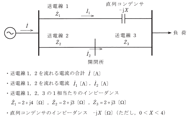 (4) となる。また,送電線 2 を流れる電流\(\dot{I_2}\) は, \(\dot{I}\)と X を用いて表すと, (5) となる。同様に,送電線 1 の電流\(\dot{I_1}\) を,\(\dot{I}\) と X を用いて表し, ∣\(\dot{I_1}\)∣ と ∣\(\dot{I_2}\)∣ を (4) に代入すると,送電損失を ∣\(\dot{I_1}\)∣ と X を用いて表すことができる。