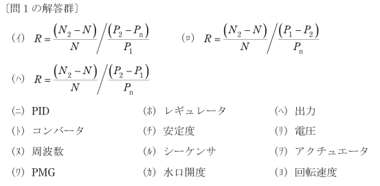 調速機は,起動時の系統並列に向けた速度調整や負荷遮断時の異常な水圧上昇等を抑える役割を持つが,通常時は,系統の (1) を安定させることが要求されており,負荷の増減に関わらず,水車の (2) を一定に保つ役割を持っている。