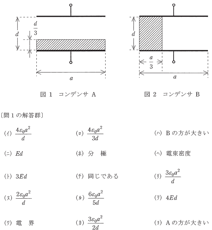 平成26年 問1 誘電体が挿入された平行平板コンデンサに関する記述 電験1種 2023.11.192024.03.24 目次 問題解答解答・解説 問題 出典:「平成26年度第一種電気主任技術者一次試験 理論科目 A問題 問1」 解答 (1) (ヘ) $$電束密度$$(2) (ロ) $$\frac{4ε_0a^2}{3d}$$(3) (ヌ) $$\frac{2ε_0a^2}{d}$$(4) (ト) $$3Ed$$(5) (ヨ) $$Aの方が大きい$$ 解答・解説