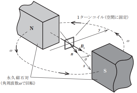 図のように,座標原点を中心として対向する永久磁石が形成する一様な磁束密度 \(B_0\) の中に,一辺の長さが aの正方形状の 1ターンコイルが設置されており,コイル面の法線ベクトルは x軸の方向を向いている。永久磁石対は座標原点を中心として xy平面内を角速度 ωで回転しており,磁界と x軸とのなす角は θ=ωtと表される。このとき,磁束密度のコイル面法線方向成分は B⋅n= (4) となるので,上記の関係式を用いてコイルに発生する交流起電力を求めることができる。
